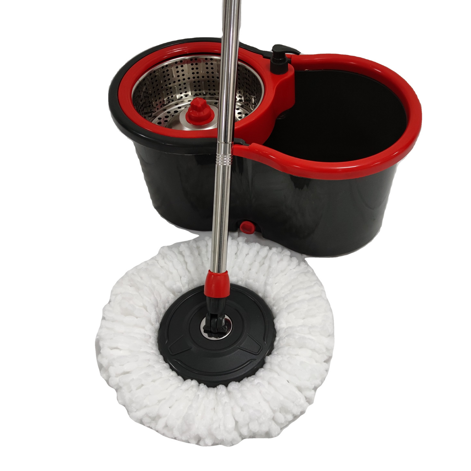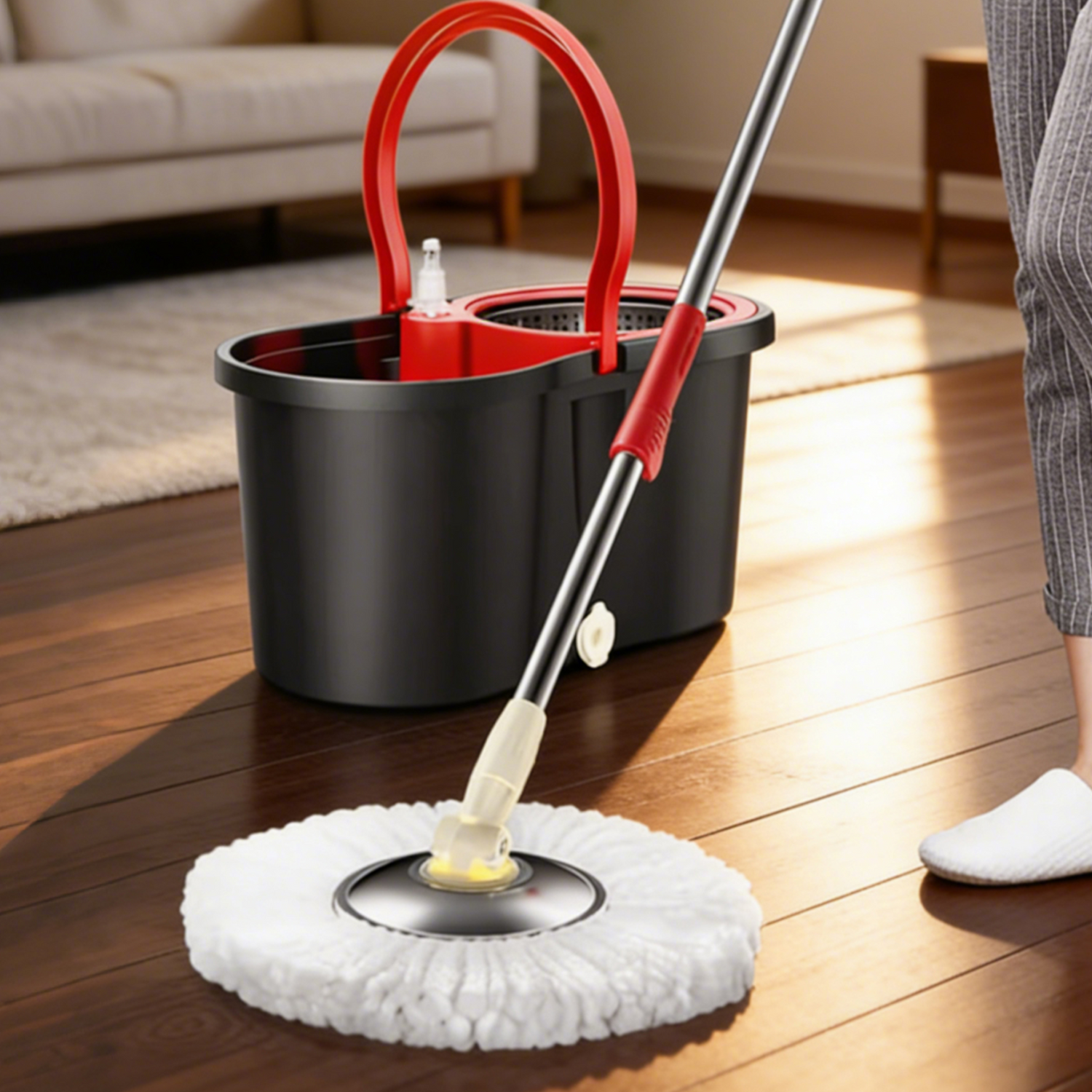 Balai serpillière rotatif avec seau essoreur pour un nettoyage rapide et sans effort. Essorage facile, mains propres et sols impeccables sur tous types de surfaces.